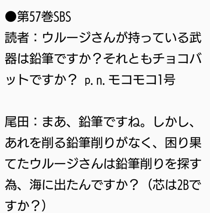 ウルージは 戦闘に武器を使う事が判明 しました。 その武器は 巨大鉛筆 です。 一部のワンピースファンの声で巨大鉛筆ではなく四皇カイドウのように武器を鉄の棍棒にしていいのではと言う声もあります。 — ジュゴン@バウンティ、ワンピース (@onepiece_Jugong) ウルージさんの使用感は硬すぎ — ジュゴン@バウンティ、ワンピース (@onepiece_Jugong) バウンティユーザーの声 おー 鉛筆おじさん ありがとう ありがと晒し 因果晒しっすわ クリムゾン ウルージ 極 16 以下、名無しにかわりましてVIPがお送りします (火) ID9uvPqie70 優秀な部下 雇う 場所ワンピースのウルージさんpart164 1 答えは鉛筆(2B)さ♪ 因果がある♪因果がある♪因果があるさ♪ 近頃の超新星はとよく言うけれど♪ 四皇の若い頃よりだいぶマシ♪